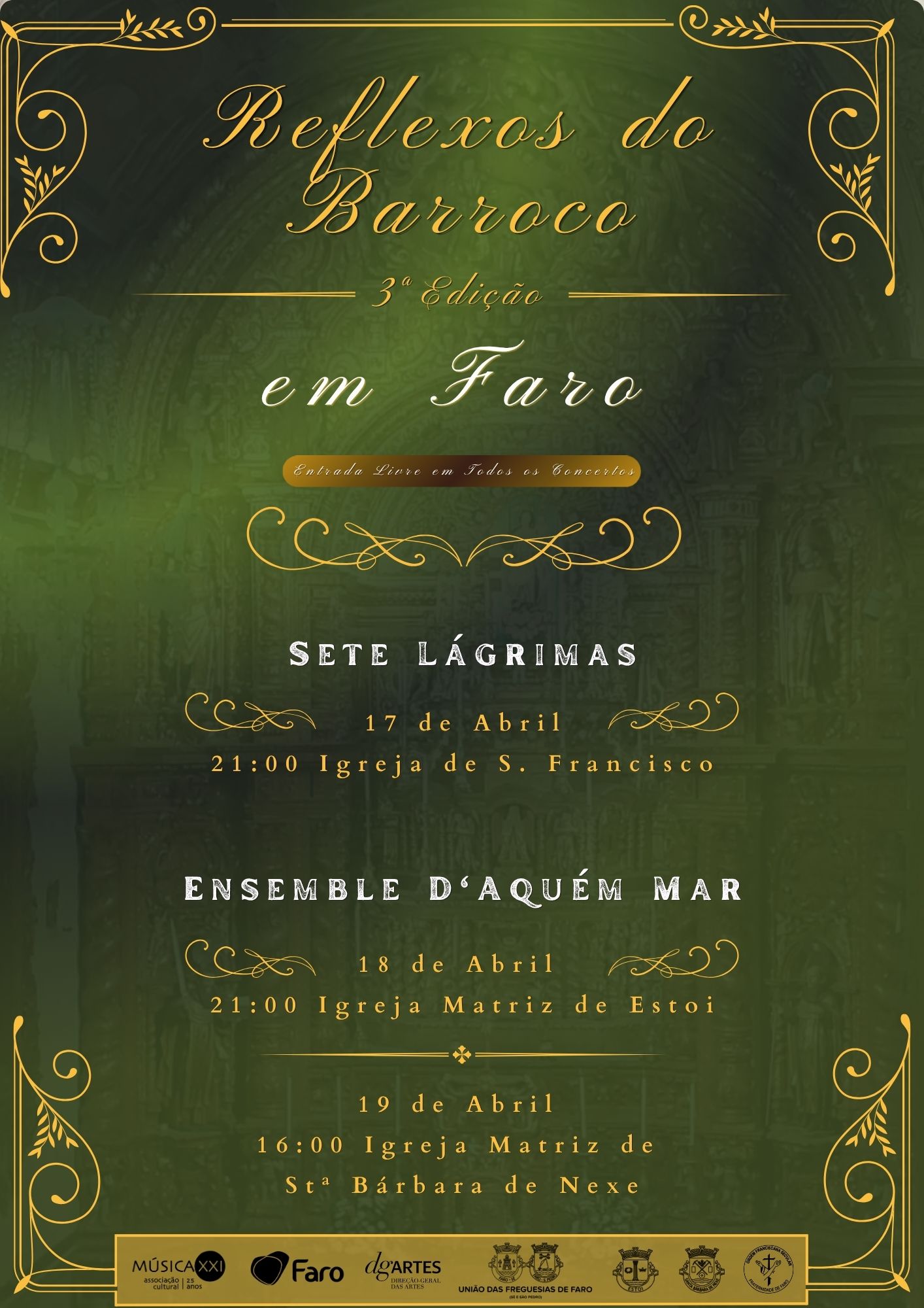 A Associação Cultural Música XXI, com o apoio do Município de Faro, vai apresentar a III Edição do Festival Reflexos do Barroco em Faro, que decorrerá entre 17 e 19 de abril em igrejas das freguesias de Faro, Estoi e Santa Bárbara de Nexe.